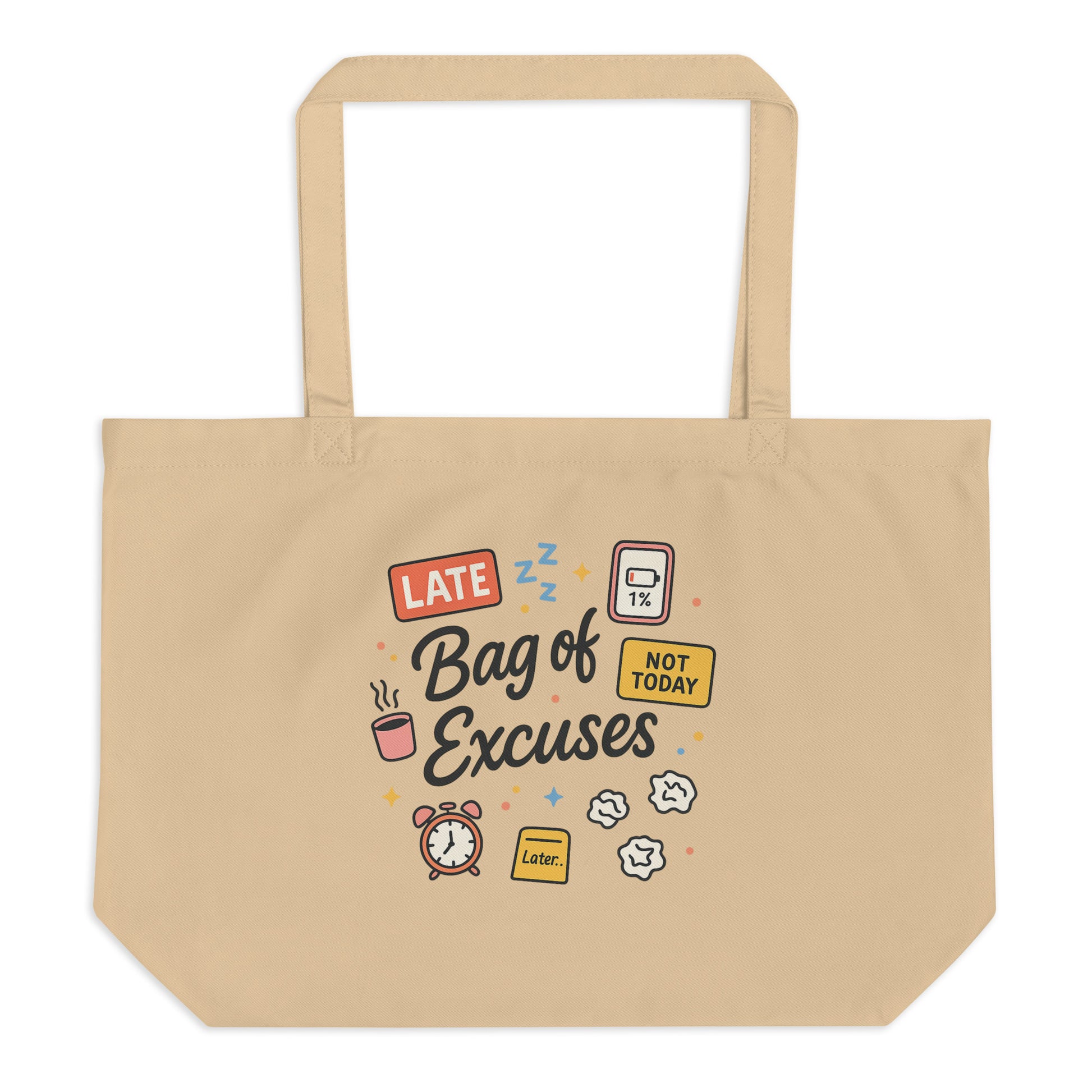 Playfully illustrated with classic procrastination icons — coffee, alarms, low battery, sticky notes, and “LATE / NOT TODAY” labels — it’s the perfect mix of humor and practicality. Roomy enough for work, school, groceries, or all the reasons you didn’t do the thing.