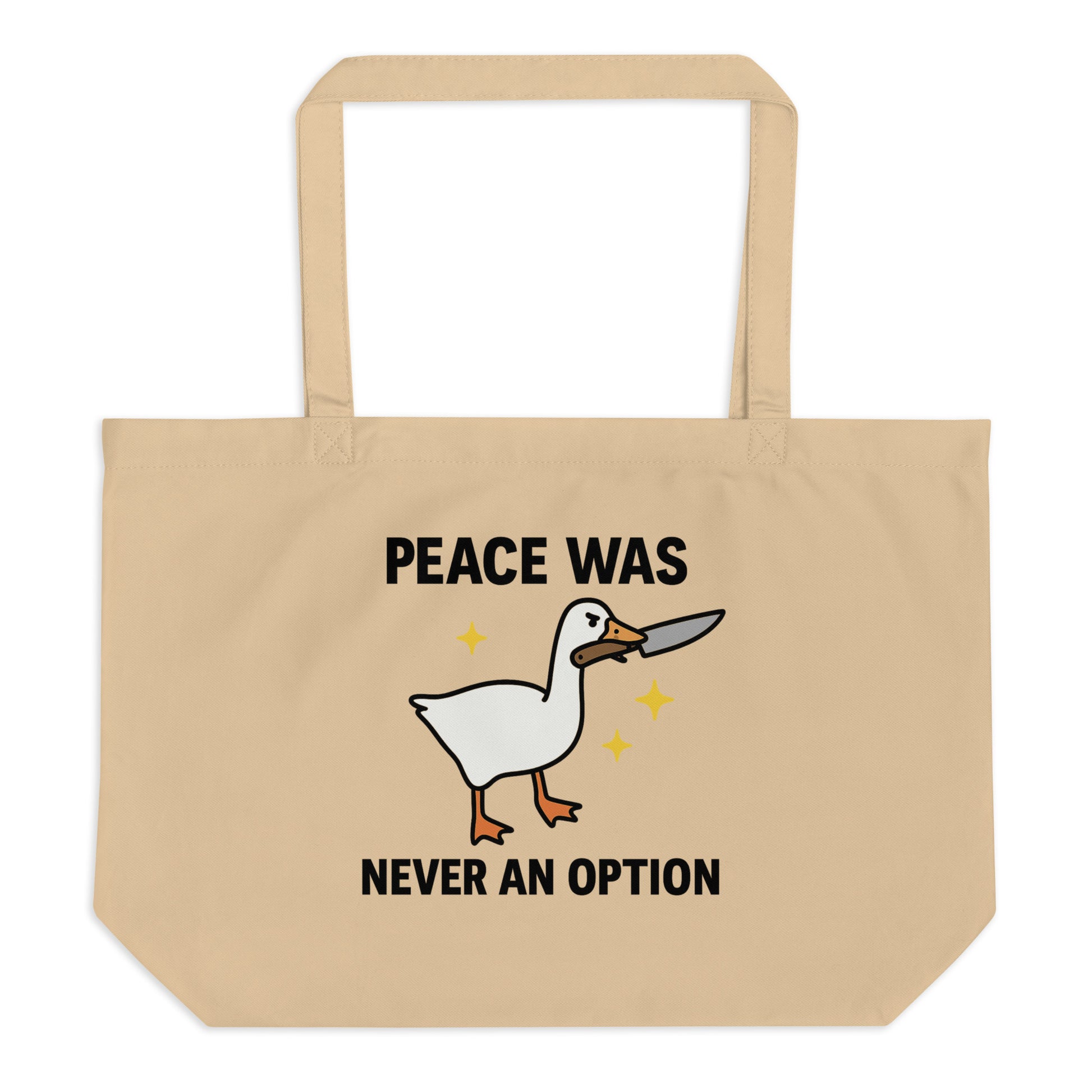 Featuring a chaotic goose with a knife and unapologetic energy, this tote is pure chaos in the best way. Peace Was Never an Option is a playful piece for those with feral spirit and humor to match.